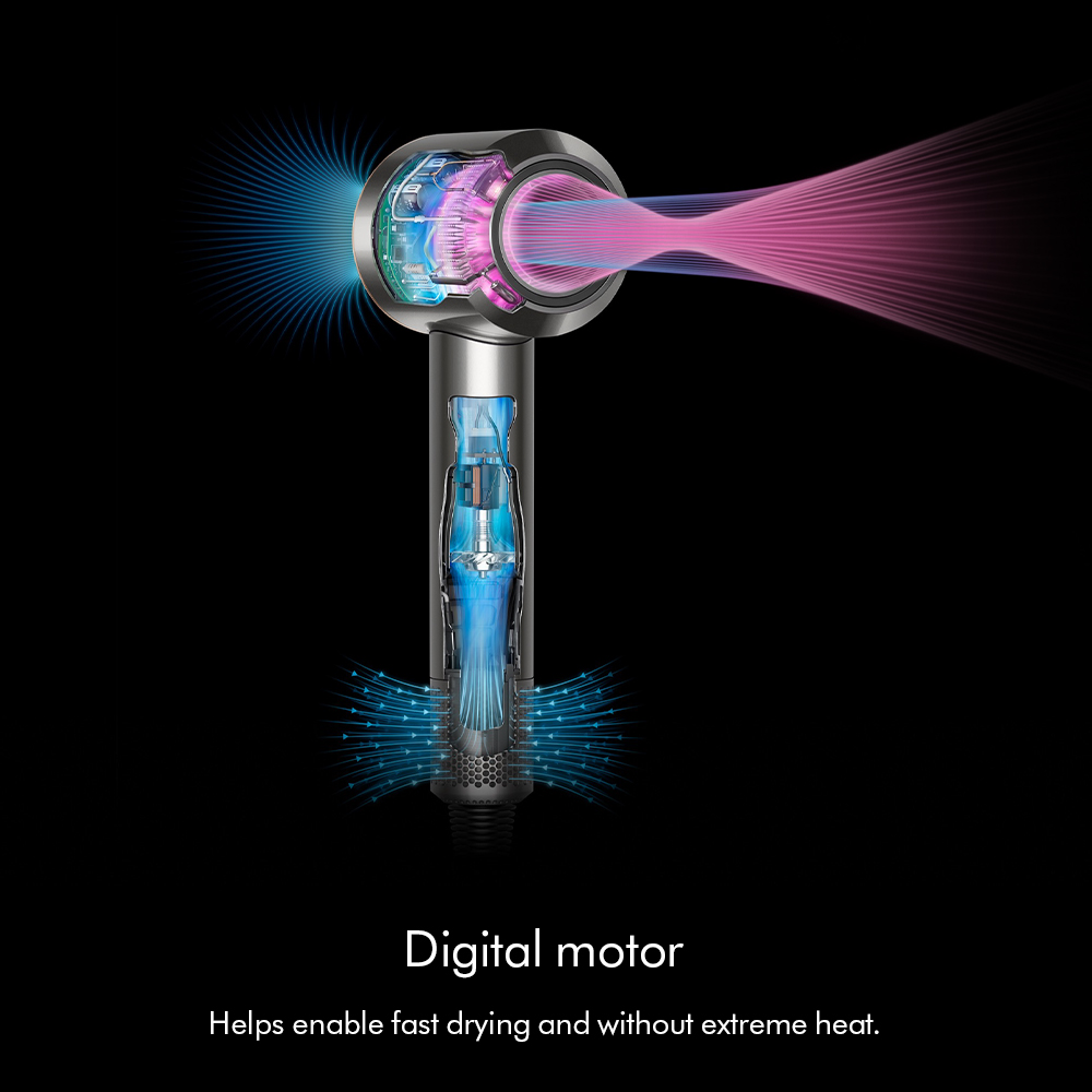 The small, powerful Dyson digital motor V9 spins at up to 110,000rpm. Combined with Air Multiplier™ technology, it produces a high-pressure, high-velocity jet of controlled air, for fast drying and precision styling.