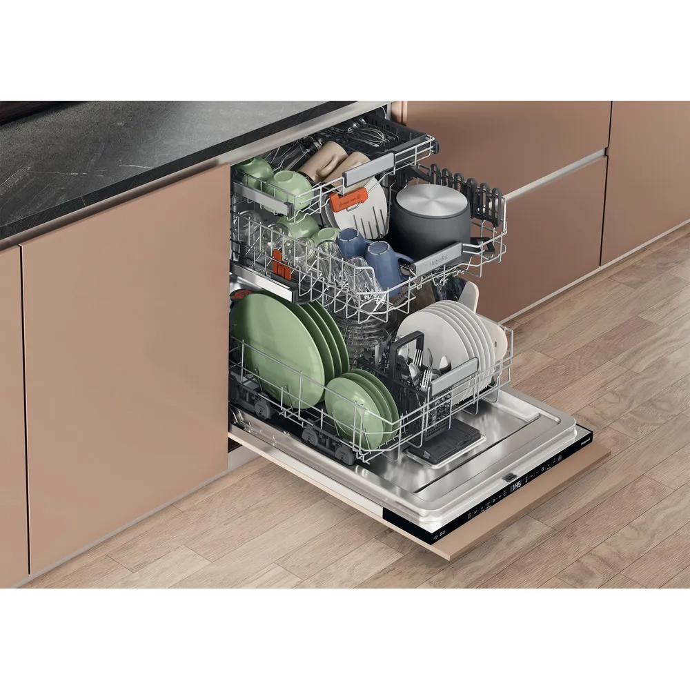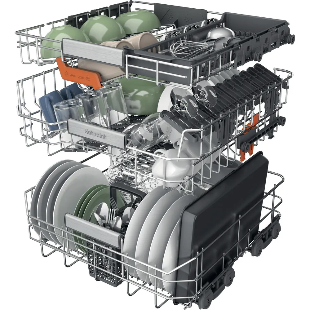 Skip the scrubbing and get a sparkling clean with a Hotpoint dishwasher. The Hotpoint H8IA115M4TUS UK built in dishwasher with a large 15 place setting capacity features the new Hydroforce 3rd rack the first on the market* with integrated spray jets** to give your 100% cleaning coverage. This dishwasher with Maxi Space tub means you get 10%*** more usable space, so you can load even mugs and small dishes into the top rack so not matter what's been on the menu today, you can count on Hotpoint to get your tableware spotless.