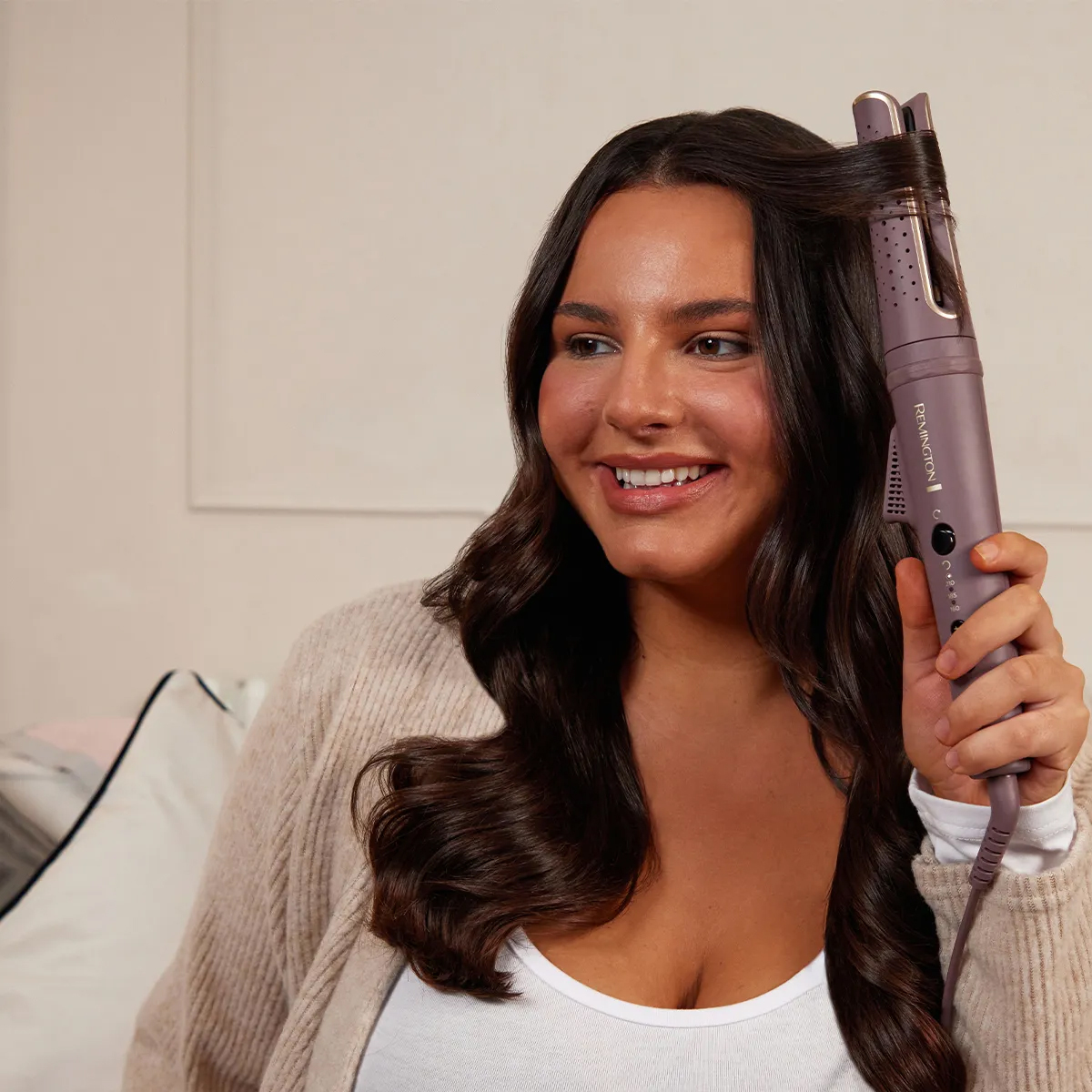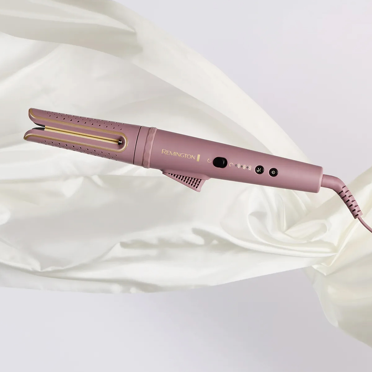 Easily define your curls with the REMINGTON® AIRvive™ Rotating Curling Wand. The gentle, anti-static Ionic Air Technology cools hair instantly to lock in curl definition, whilst ultra-smooth ceramic styling plates infused with heat activated micro-conditioners deliver smooth curls and all-day frizz freedom1. The rotating split barrel with an easy-to-use rotation lever means no more wrist twisting. Simply insert your chosen section of hair, press the lever, and glide through slowly, varying each curl with the curl direction selector for a natural-looking result. You stay completely in control, with the actively cooled barrel and 3 digital heat settings, from 160 ?C-210 ?C (320 ?F-410 ?F), so you can select the right temperature for your hair and the result you want. Style at lower temperatures for looser curls or turn up the heat to get tighter, more defined curls. The ultra-smooth ceramic coating on the styling plates contains 10x more ceramic2, to glide effortlessly through your hair without snagging, and the advanced heating system distributes the heat precisely and evenly, so you can get results with one pass3 and experience less heat exposure4.