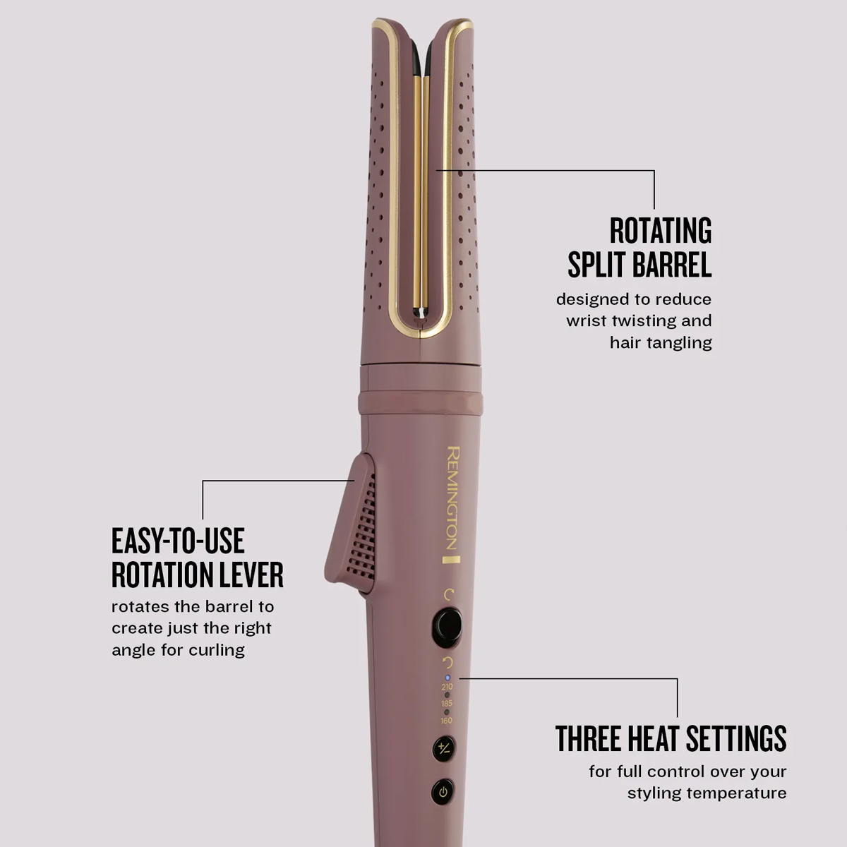The rotating split barrel has been cleverly engineered to reduce wrist twisting and hair tangling, helping you curl your hair with minimum technique and maximum effect.