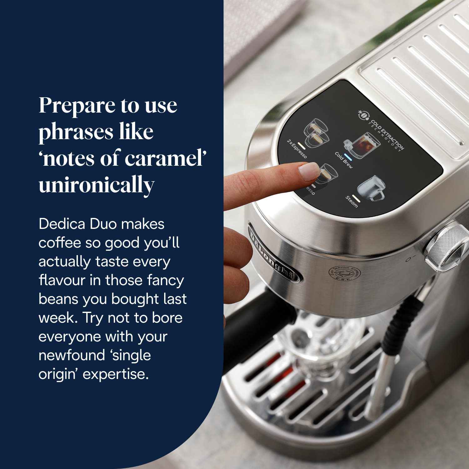 - Coffee shop quality drinks, made by you: Cold Brews by day, Espresso Martinis by night. Dedica Duo makes lattes, cappuccinos, and Macchiatos a realistic part of your daily routine.
