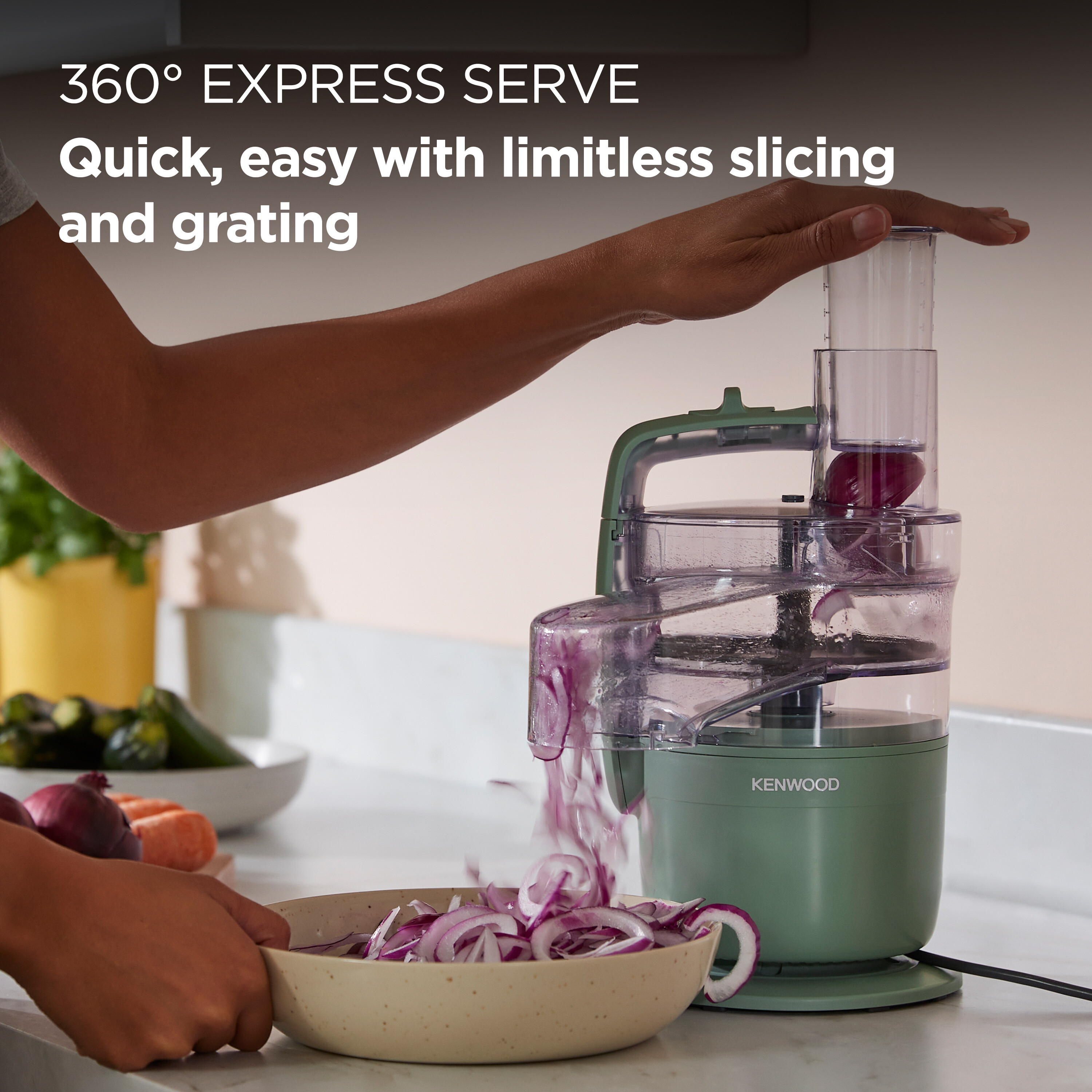 It chops, slices and grates straight onto your plate, all from a compact design that tucks neatly onto your worktop, into a drawer, or wherever space allows.