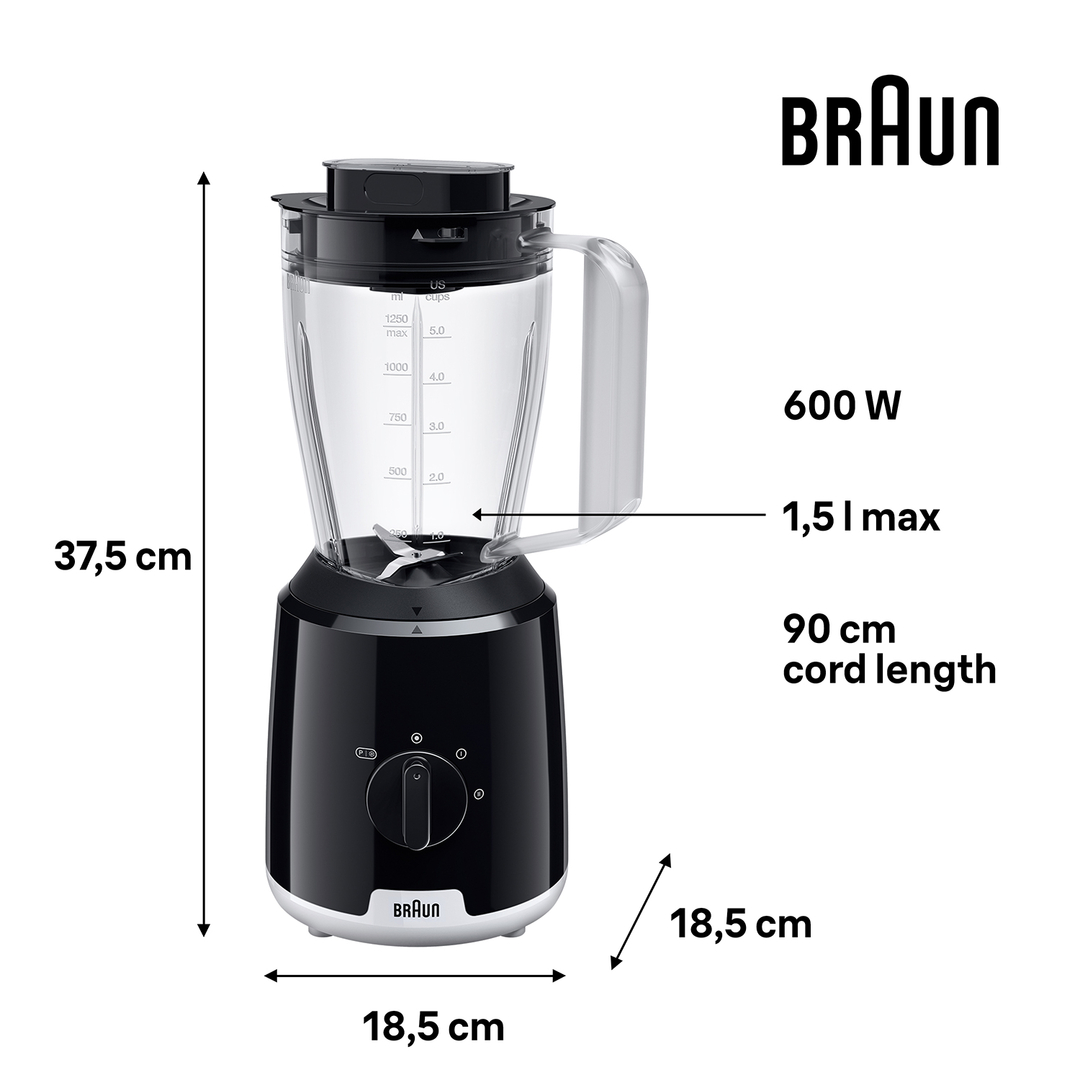 The PowerBlend 1 is compact and convenient to store in small kitchens, but still equipped with the innovative TriAction Technology – a feature that all Braun jug blenders share. Thanks to TriAction Technology’s specially designed triangular-shaped jug, blind spots are avoided and the ingredients are redirected faster to the blending area. The efficient 600-watt motor makes preparing your favourite food and drinks fast and easy.