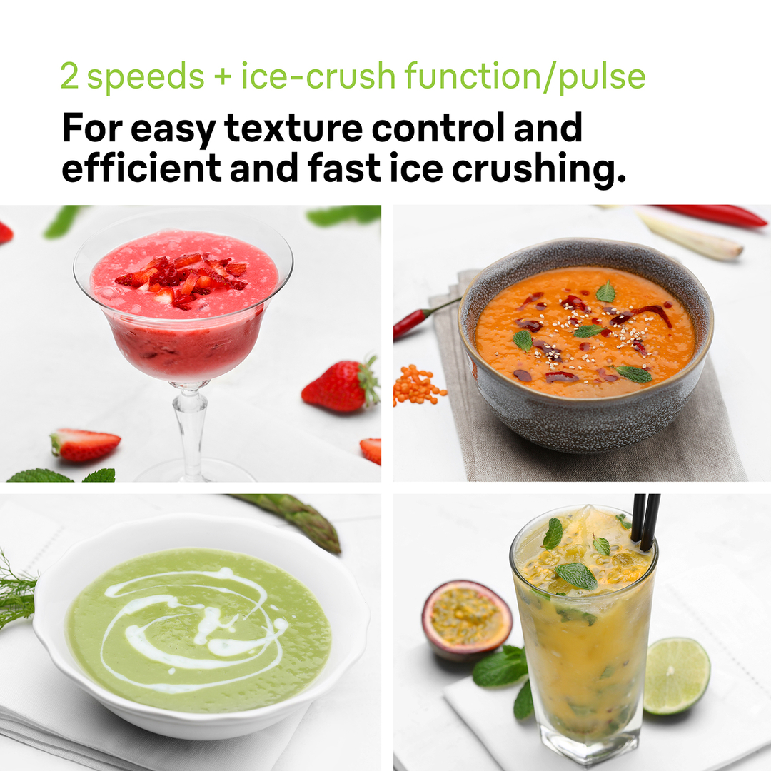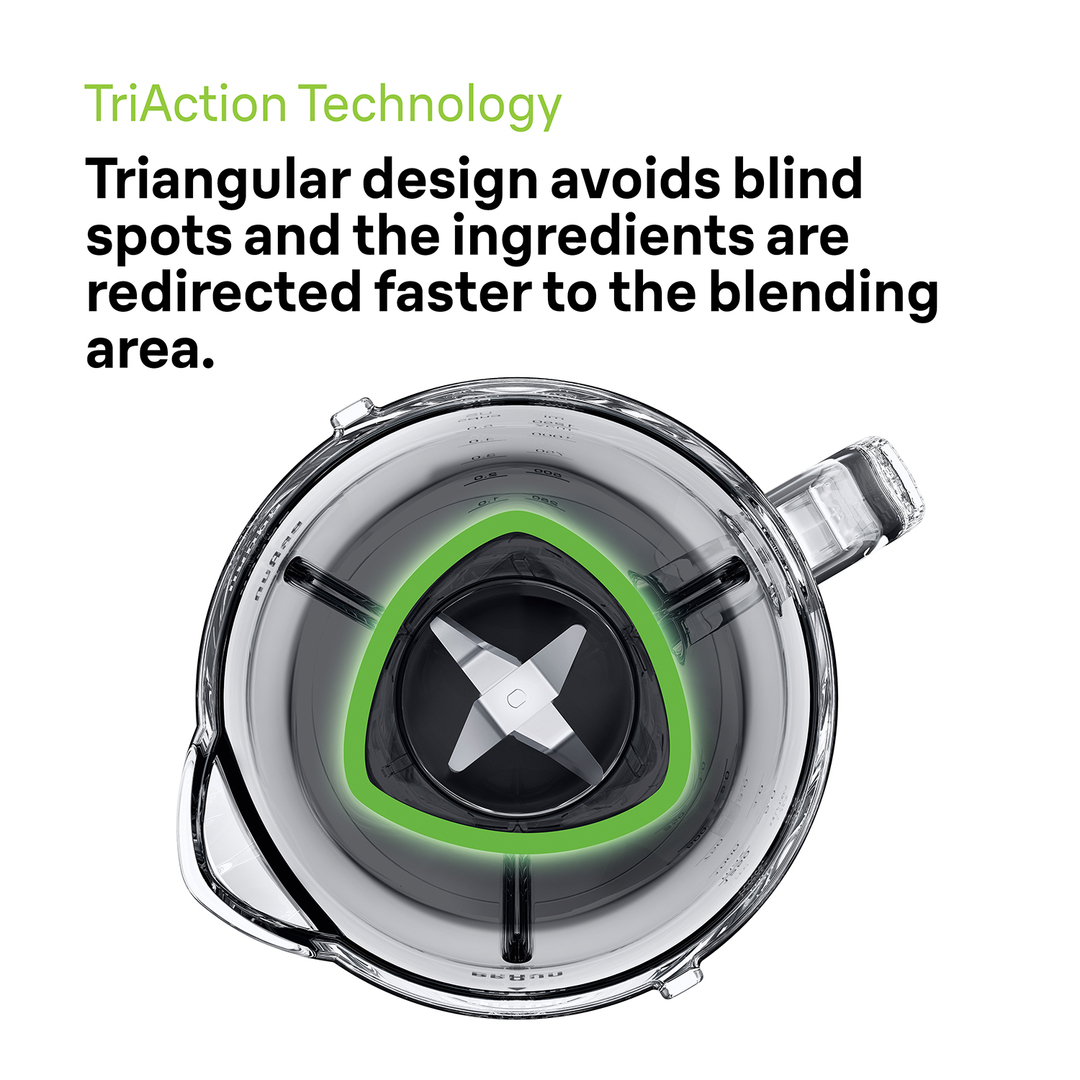 Blend all kinds of food. Thanks to the specially designed triangular-shaped jug, blind spots are avoided and the ingredients are redirected faster to the blending area.