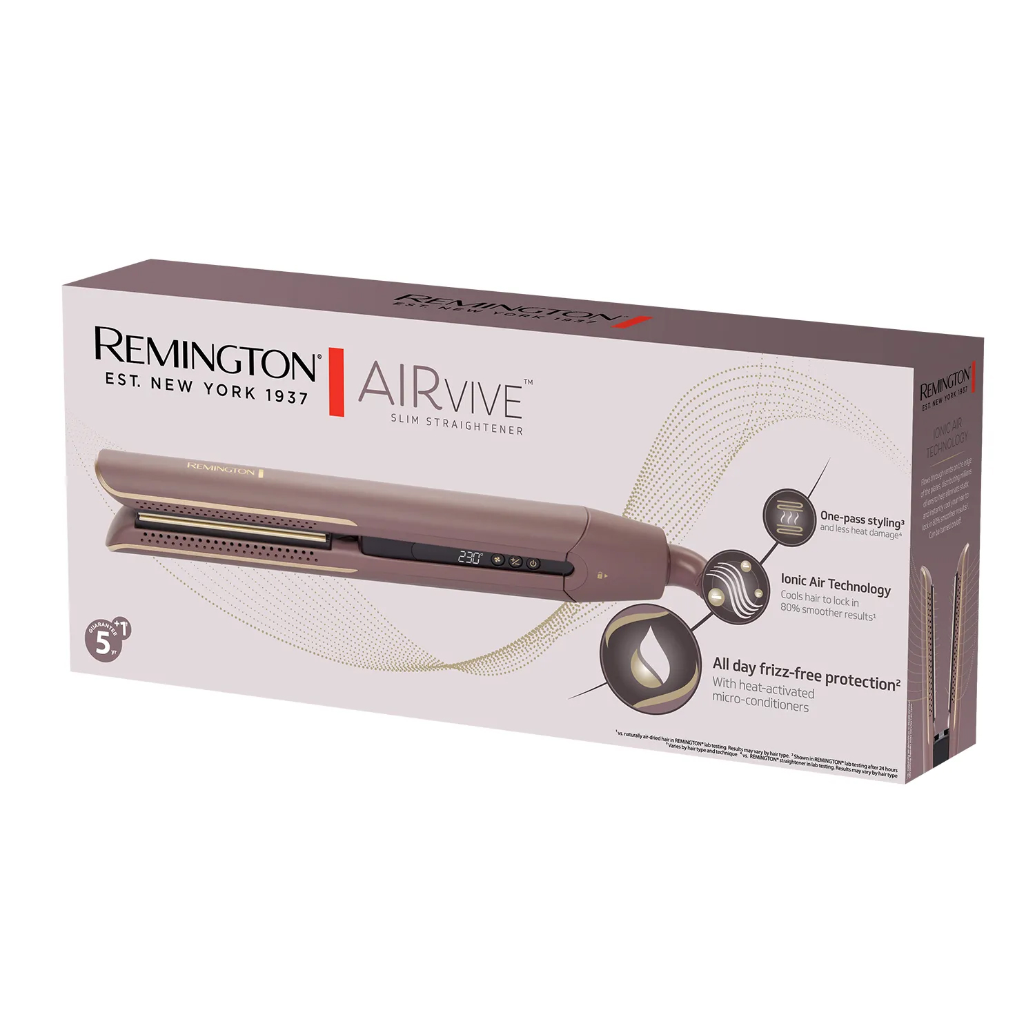 Meet the AIRvive™ Slim Straightener. With anti-static Ionic Air Technology and heat activated micro-conditioners to give you 80% smoother results1 that last all day2. It features five digital heat settings ranging from 150°C to 230°C (300°F to 450°F) and an advanced heating system that distributes heat evenly across the styling plates for one-pass results3 and less heat damage4.