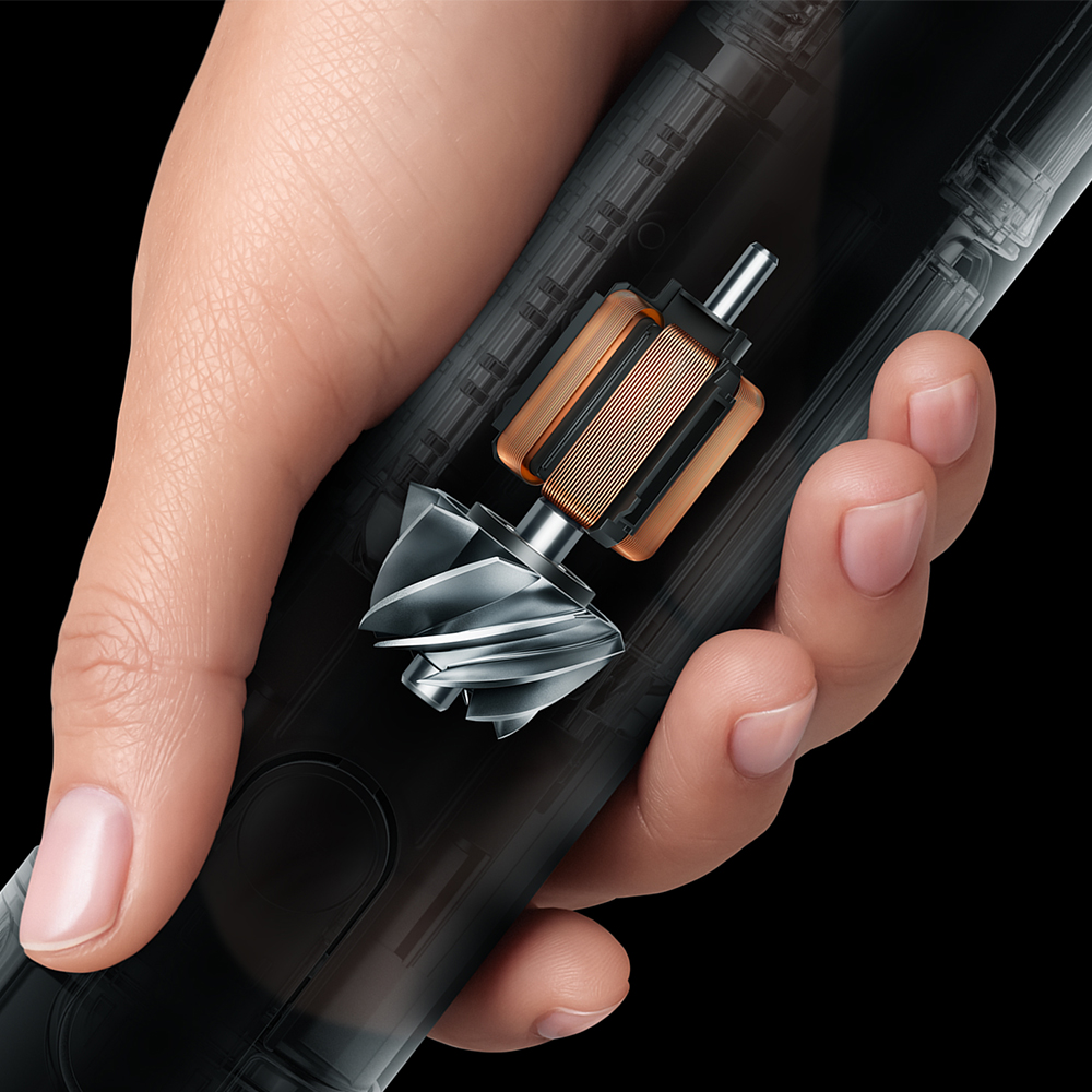The first vacuum with four soft conical brush bars to de-tangle long hair and clean right to the edge.