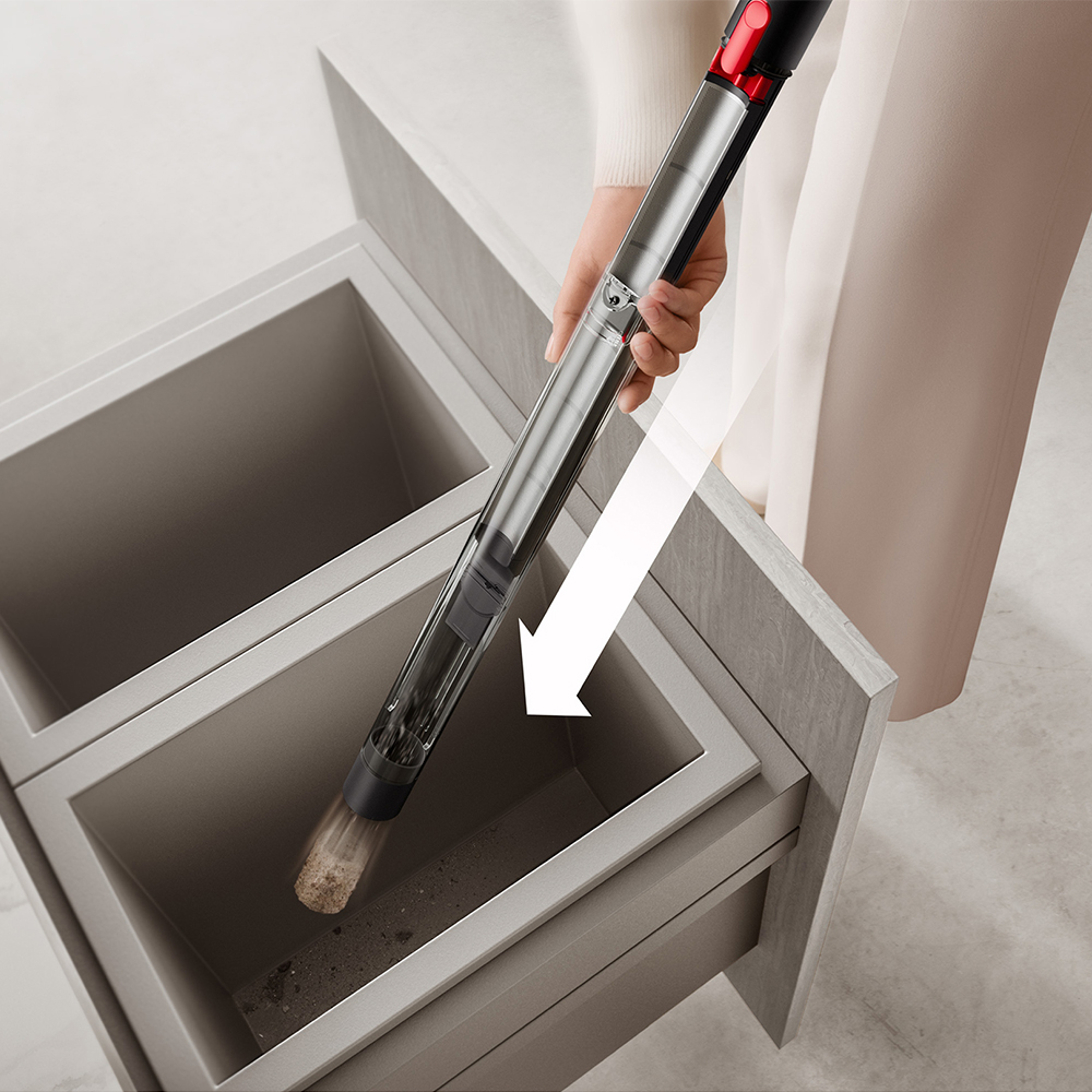Dyson's new syringe action bin emptying system reduces dust clouds by pushing compressed dust deep into your bin. For hygienic emptying.