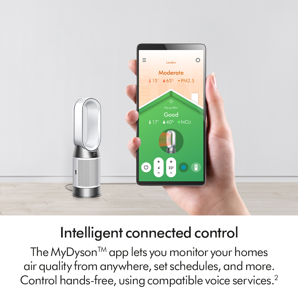 Using the MyDysonTM app lets you see which pollutants have been captured, set schedules and more. Control hands-free, using compatible voice services such as Amazon Alexa, Google Assistant or Siri.2