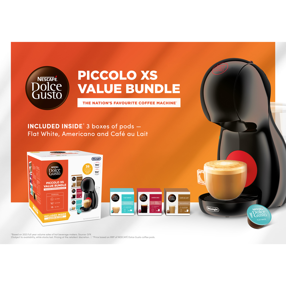 The extra-small NESCAFÉ® Dolce Gusto® Piccolo XS pod coffee machine, with its tiny footprint and modern style, is expertly designed to fit in any kitchen. The NESCAFÉ® Dolce Gusto® Piccolo XS is only 14cm (W) x 28cm (H) x 27cm (D) with 0.8L water tank. Plus 36 delicious coffee shop style drinks* to help you get started with your NESCAFÉ® Dolce Gusto® coffee machine. Create professional quality coffees with a thick velvety crema, thanks to the machine’s high-pressure system (up to 15 bar pump pressure). With the hermetically sealed NESCAFÉ® Dolce Gusto® and STARBUCKS® pods, which preserve coffee freshness, you’ll enjoy rich aromatic cups every time.