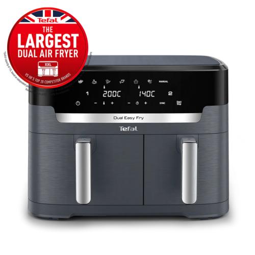 Dual Easy Fry XXL - Tefals largest air fryer cooks up to 2x more than our smaller Dual model*! Prepare a complete meal for the whole family in one go! From Sunday roast or mouthwatering salmon to crispy fries or favourful vegetables. Cook a wide variety of balanced, delicious meals. Two drawers-two sizes, synchronized cooking, covering a large drawer that holds big ingredients and a regular drawer that's perfect for sides. Seven pre-set programs make cooking a breeze, while a dishwasher-safe basket ensures effortless clean-up.