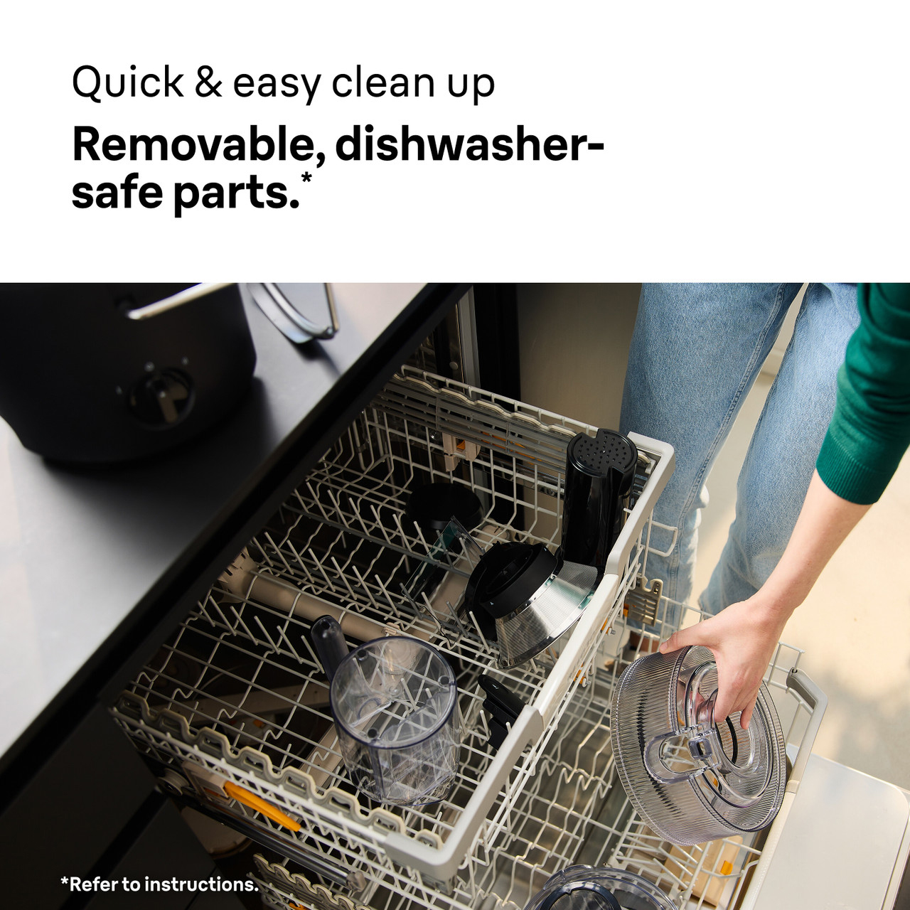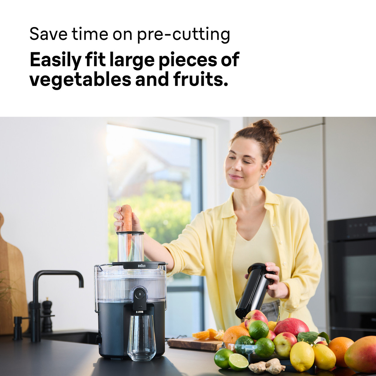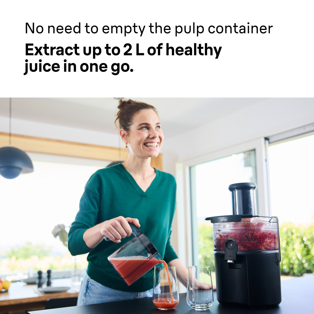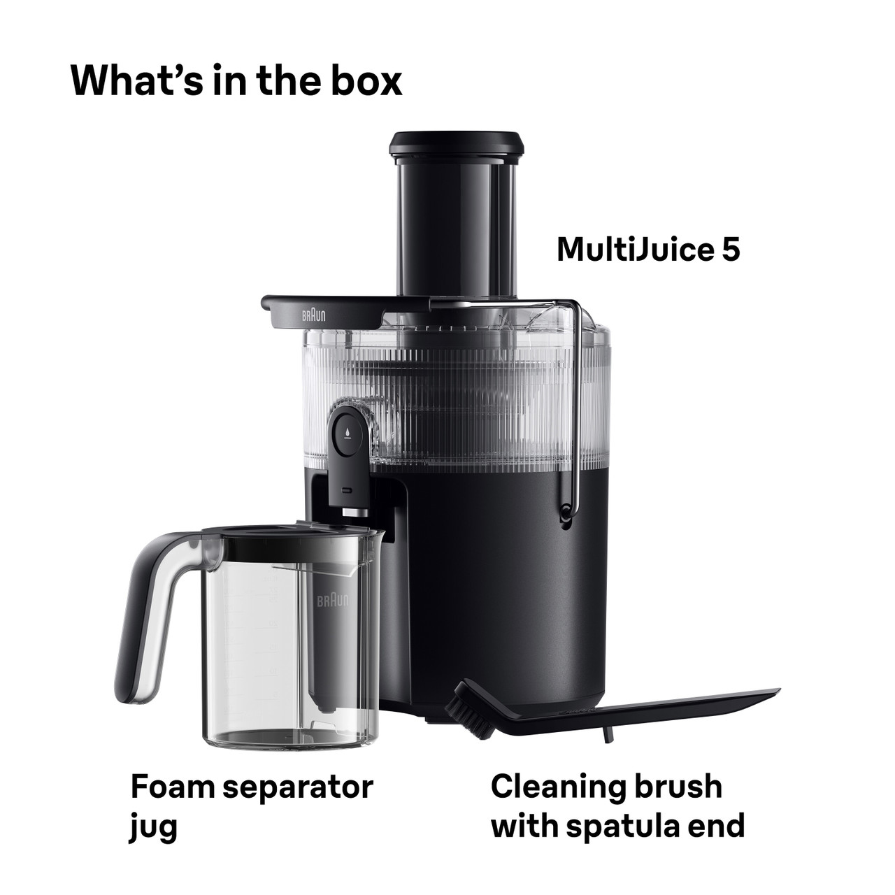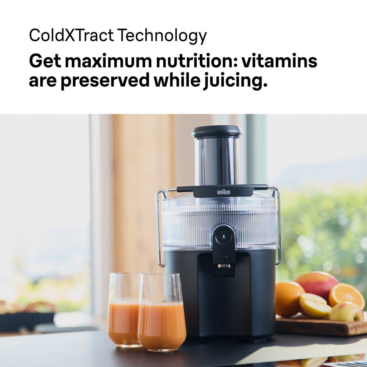 Enjoy a glass of fresh, vitamin-packed juice in under 15 seconds with the multijuice 5. Its powerful 800w motor extracts juice from whole apples, chunky veg and leafy greens without stopping, while coldxtract technology prevents heating, keeping vitamins intact. The thoughtfully designed large chute, anti-drip pour, and streamlined cleaning make it simple to enjoy healthy juice every day, without mess or fuss.